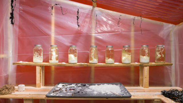 Morris Lum, Joy Wong, and Stephanie Yee bring together large-scale photographs with installation and sculptural works that use experimental materials like MSG and symbiotic cultures of bacteria and and yeast (SCOBY). Through these ingredients, food preparation techniques, and vivid images, their distinct ways of working connect aspects of food culture that are significant to Chinese diaspora communities with intangible assets like care, authenticity, and belonging.