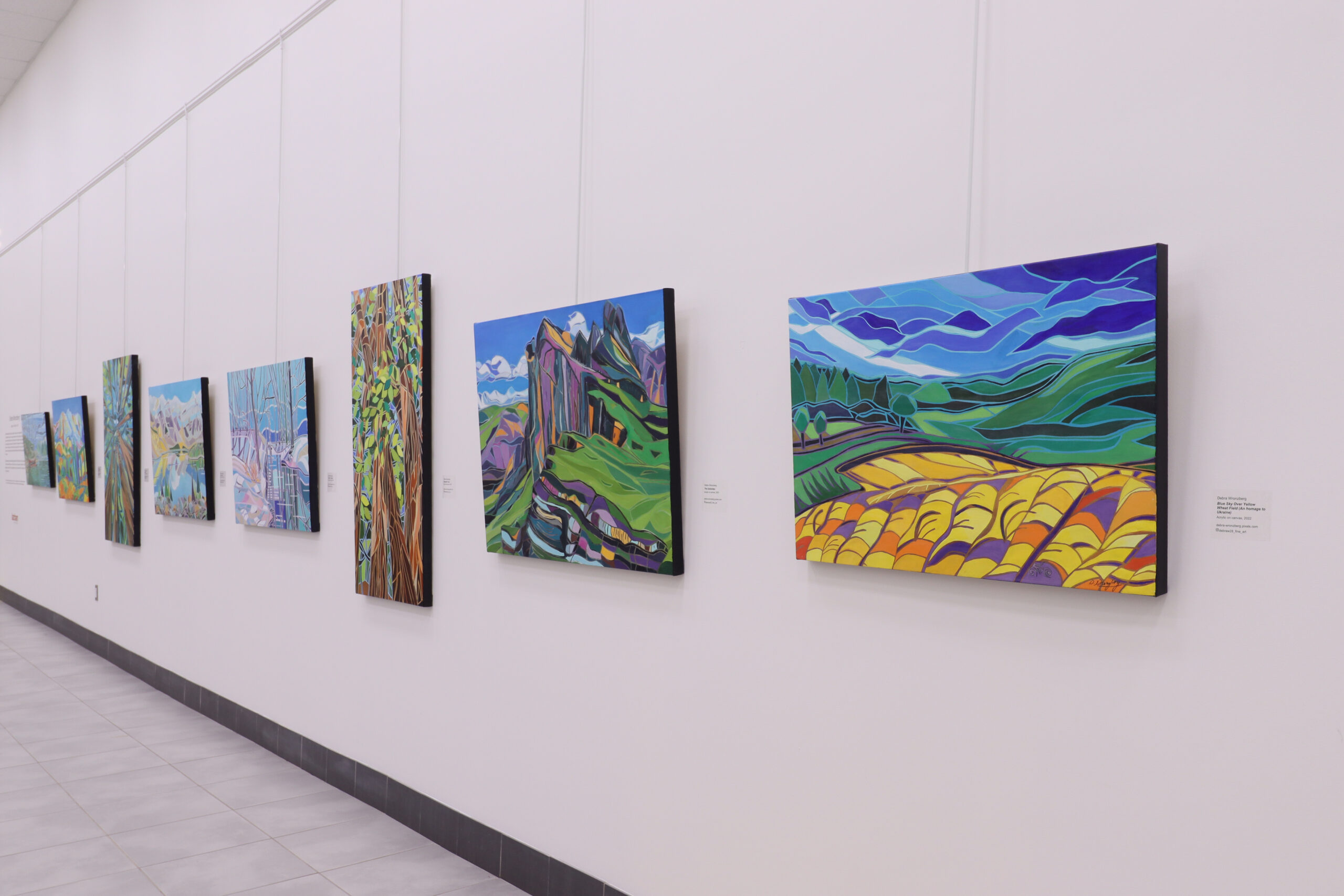 Debra Wronzberg’s artistic practice explores various styles and approaches to painting. This exhibition features her signature geometric, abstract landscapes that resemble mosaics. Wronzberg deconstructs and reconstructs her subjects to portray them in new and engaging ways. This approach is influenced by the Japanese art of Kintsugi, which involves the repairing of broken pottery using liquid gold. The concept that “what is broken can be repaired and become stronger” deeply resonates with Debra’s approach to artmaking.