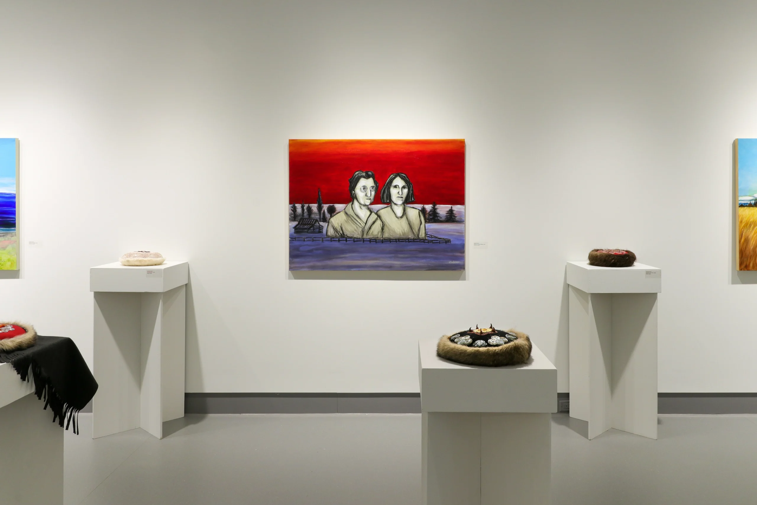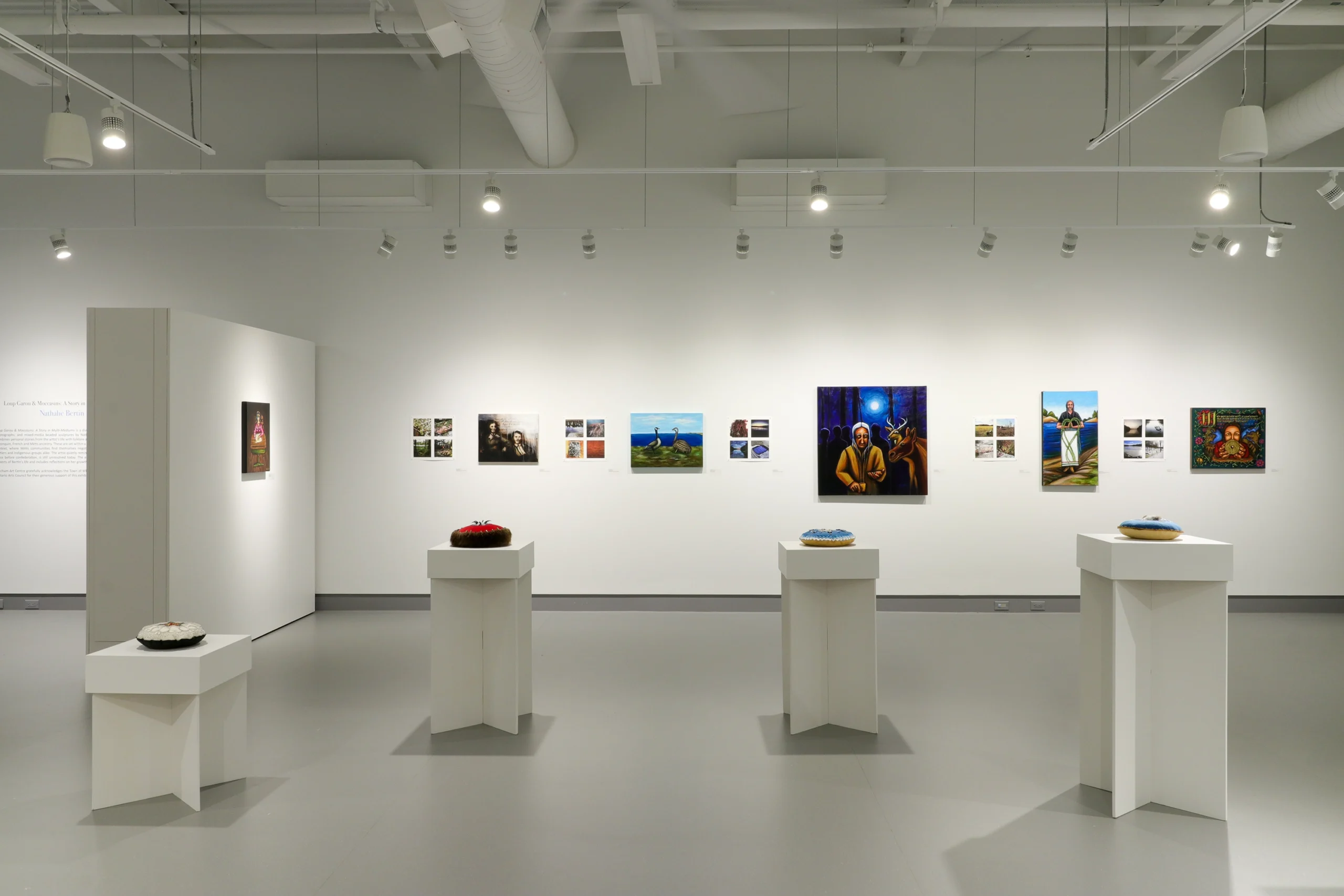 Loup Garou & Moccasins: A Story in Multi-Mediums is a diverse collection of paintings, photographs and mixed-media beaded sculptures by Bonfield-based, Franco-Métis artist Nathalie Bertin. The exhibition combines personal stories from the artist’s life and upbringing, centered within a larger, ongoing context of negotiating identity that Métis communities have had to process and resolve for centuries.