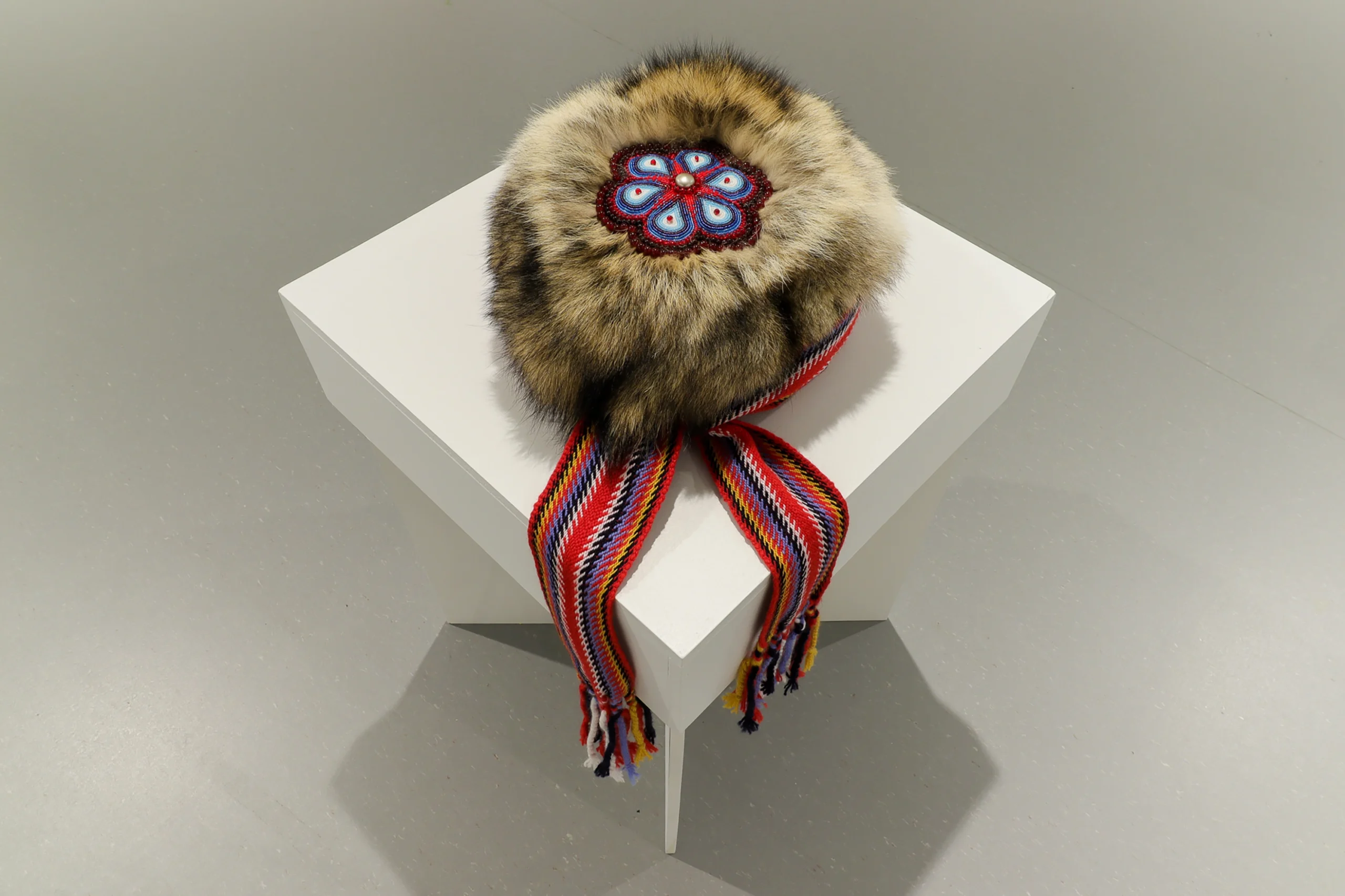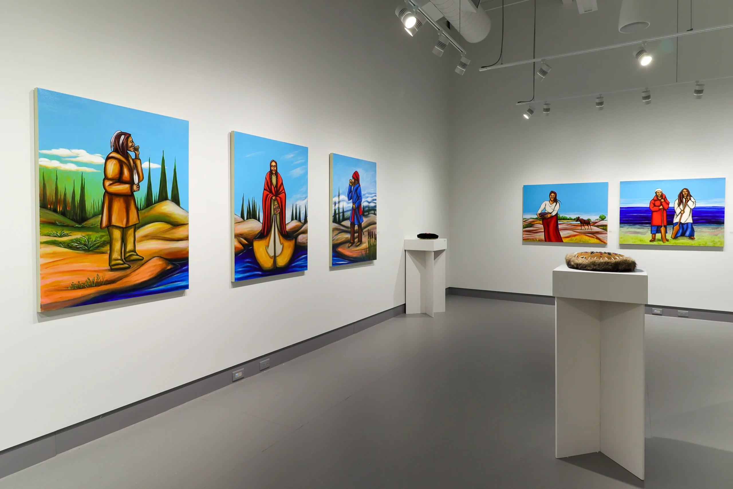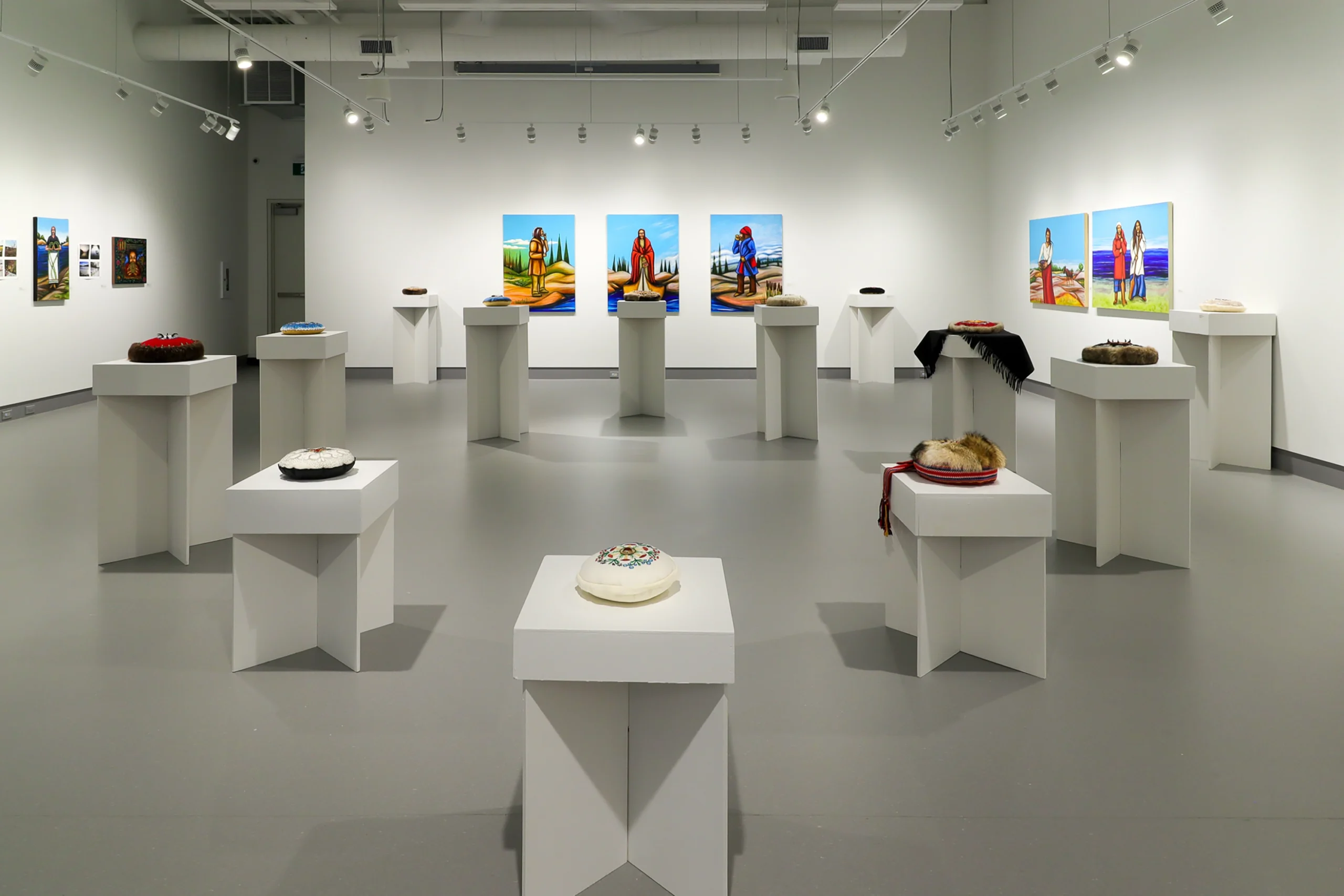 The exhibition pauses on different aspects of Bertin’s life, starting with early-learned stories and tales expressed through the creation of moccushions. These sculptures use beadwork, silk embroidery, quills, fish scales, and other materials to acknowledge meticulous Métis craftwork and other traditional designs relevant to the artist’s upbringing. On surrounding gallery walls, paintings and short photo-essays tell stories of Bertin’s life so far, including reflections on her growth, ancestors, and her thoughts and dreams.