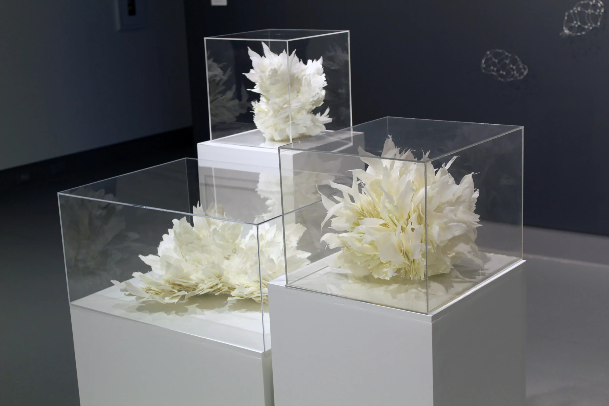 Travaillant à la croisée de la matérialité et de la conscience, l'artiste Katja van den Enden, basée à Newmarket, crée des installations sculpturales immersives et profondes qui explorent les tensions visuelles et la pensée subconsciente. Elle explore les interconnexions éthérées de la pensée et des idées à travers des formes élaborées avec minutie., Dispersé/Accumulé Non seulement elle nous invite à faire une pause et à réfléchir à la matérialité et à la forme, mais elle nous encourage également à participer et à nous impliquer.